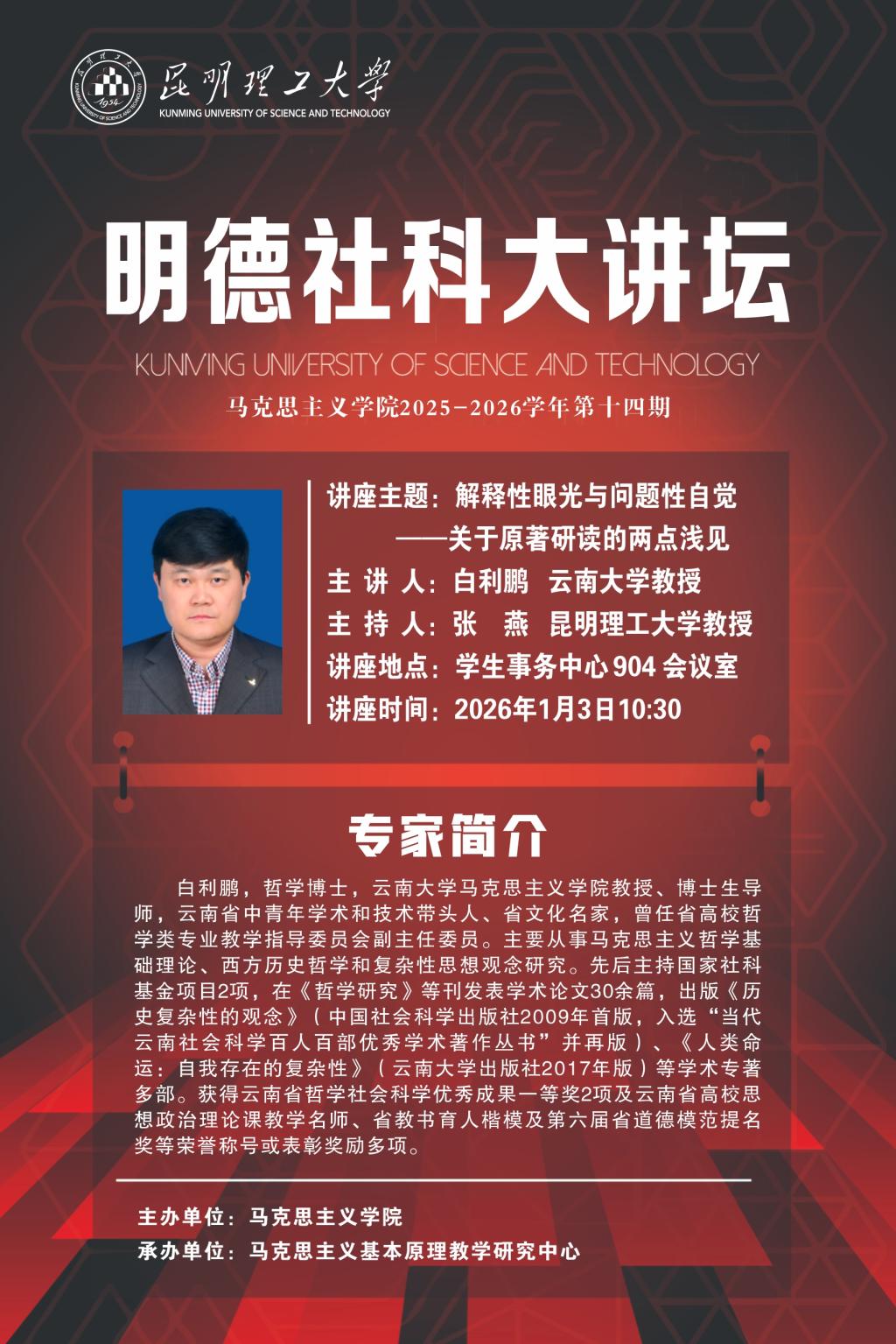 2026-01-03日前,经云南省委同意:云南省政府聘任杨斌同志为昆明理工大学校长(聘期五年)。12月30日,昆明理工大学召开教师干部会议。省委组织部副部长郑传贵同志宣布省委决定并讲话,省教育厅厅长、党组书记、省委教育工委副书记李炳泽同志出席会议并讲话。昆明理工大学党委书记唐家华主持会议。云南省委组织部、省教育厅(省委教育工委)相关处室负责同志,昆明理工大学领导班子成员及其他省管干部、部门负责同志、院系主要负责同志及...