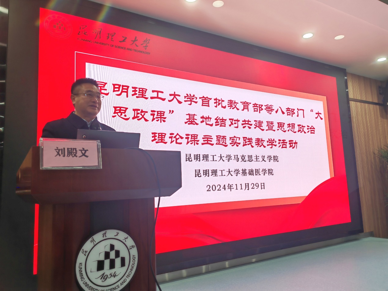 11月29日,昆明理工大学举行首批教育部等八部门“大思政课”实践教学基地结对共建暨思想政治理论课主题实践教学活动。昆明理工大学党委常委、副校长刘殿文出席活动并致辞。学校宣传部、教务处、学生处、研究生院、校团委、马克思主义学院、医学院有关负责人,云南省高校思政课“手拉手”共建计划第二组成员单位教师、马院教师代表、团员青年共60余人参加活动。