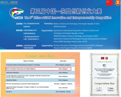昆明理工大学材料科学与工程学院胡劲教授、熊仕昭教授、王检特聘教授联合马来亚大学先进能源团队Woo Haw Jiunn教授、Mohd Hamdi Bin Ali博士、Hu Xueshan博士打造的“Root-Li Revolution: Branching Out to Better Batteries”团队项目,在大赛中荣获合作之星奖,将液态金属改性下一代锂电池集流体这一关键材料的产业转化应用推向中国-东盟国际赛场和潜在的国际市场。