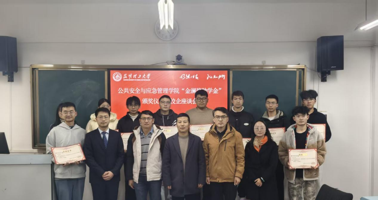 为支持昆明理工大学教育事业发展,推进安全工程专业建设和学科高质量发展,1月7日下午,公共安全与应急管理学院举办“金澜奖助学金”颁奖仪式暨校企座谈会。云南金澜矿业集团有限公司总经理董金松、办公室主任谭昆,公共安全与应急管理学院相关负责人,获奖学生及学生干部代表参会。