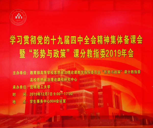 此次为深入学习贯彻党的十九届四中全会精神,按照中共中央办公厅、国务院办公厅印发《关于深化新时代学校思想政治理论课改革创新的若干意见》文件精神,研讨交流进一步深化新时代“形势与政策”课教学改革,第一时间推动党的理论创新成果进教材进课堂进学生头脑的集体备课会暨年会,由教育部高等学校思想政治理论课教学指导委员会“形势与政策”课分教指委、高校思想政治理论课程研究中心主办,昆明理工大学承办,教育部“形势与政策”分教指委、各省级分教指委委员,以及来自全国各高校马克思主义学院、相关单位的70余位专家学者参加。