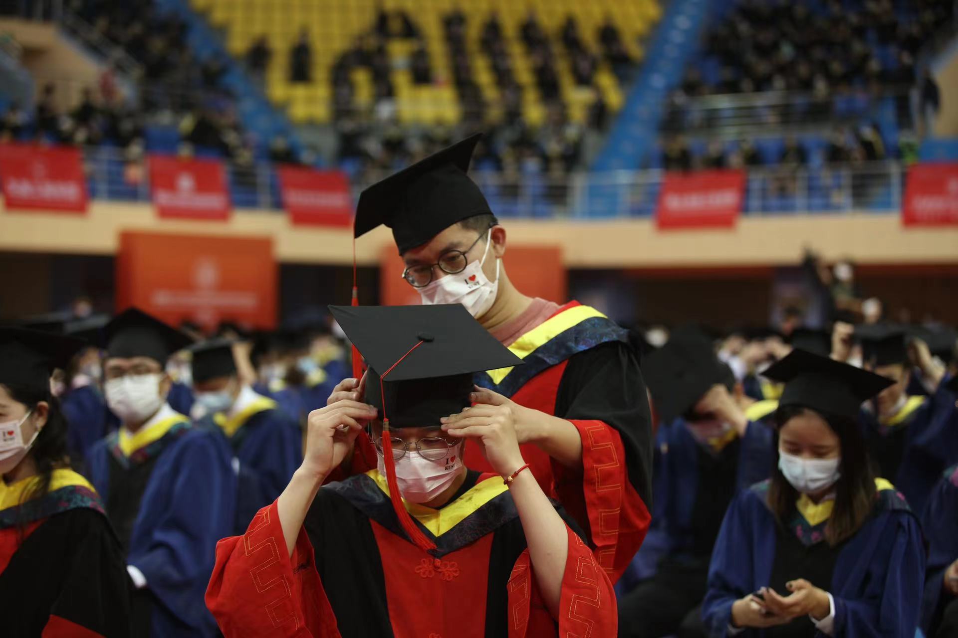 在学位授予仪式上,参加仪式的领导为毕业生一一拨穗、合影留念,并送上真诚的祝福。