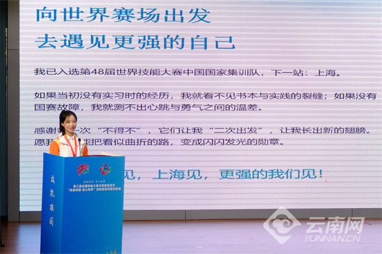 “我叫李雨霞,是昆明理工大学酒店管理专业的一名大四学生,也是云南交通技师学院的一名实习指导教师。今天,我想和大家分享我‘二次选择’的故事—即将本科毕业时,我为何‘二次出发’,一头扎进技能的海洋。这并非一时冲动,而是源于一次触动。”第三届全国技能大赛酒店接待(世赛选拔项目)金牌获得者李雨霞的激情讲述感动全场。