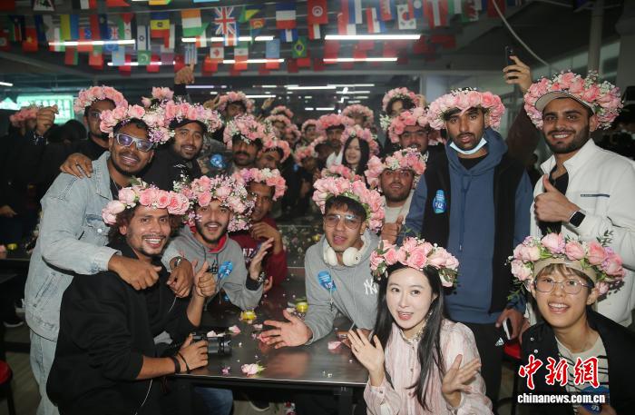 11月15日,青年代表们头戴花环,在斗南花卉市场合影。黄兴鸿 摄