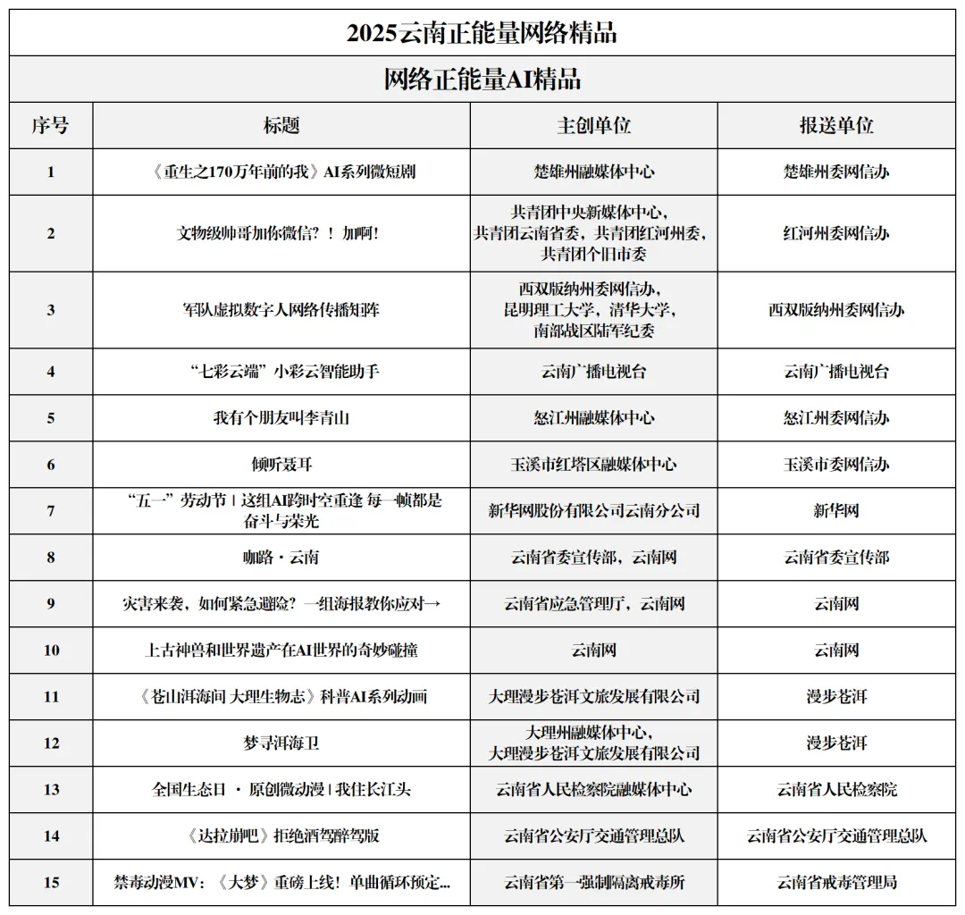 2025中国正能量网络精品和中国正能量网络传播AI精品案例入选名单在3月28日至29日举行的2026中国网络媒体论坛上正式发布。云南省共有10件作品入选中国正能量网络精品,3件作品入选中国正能量网络传播AI精品案例。 为做大做强网上正面宣传的声量、流量,云南省同步开展了2025云南正能量网络精品征集展播活动,发掘和推出了515件有温度、有力量、有影响力的云南网络正能量精品。现将名单一并公布。