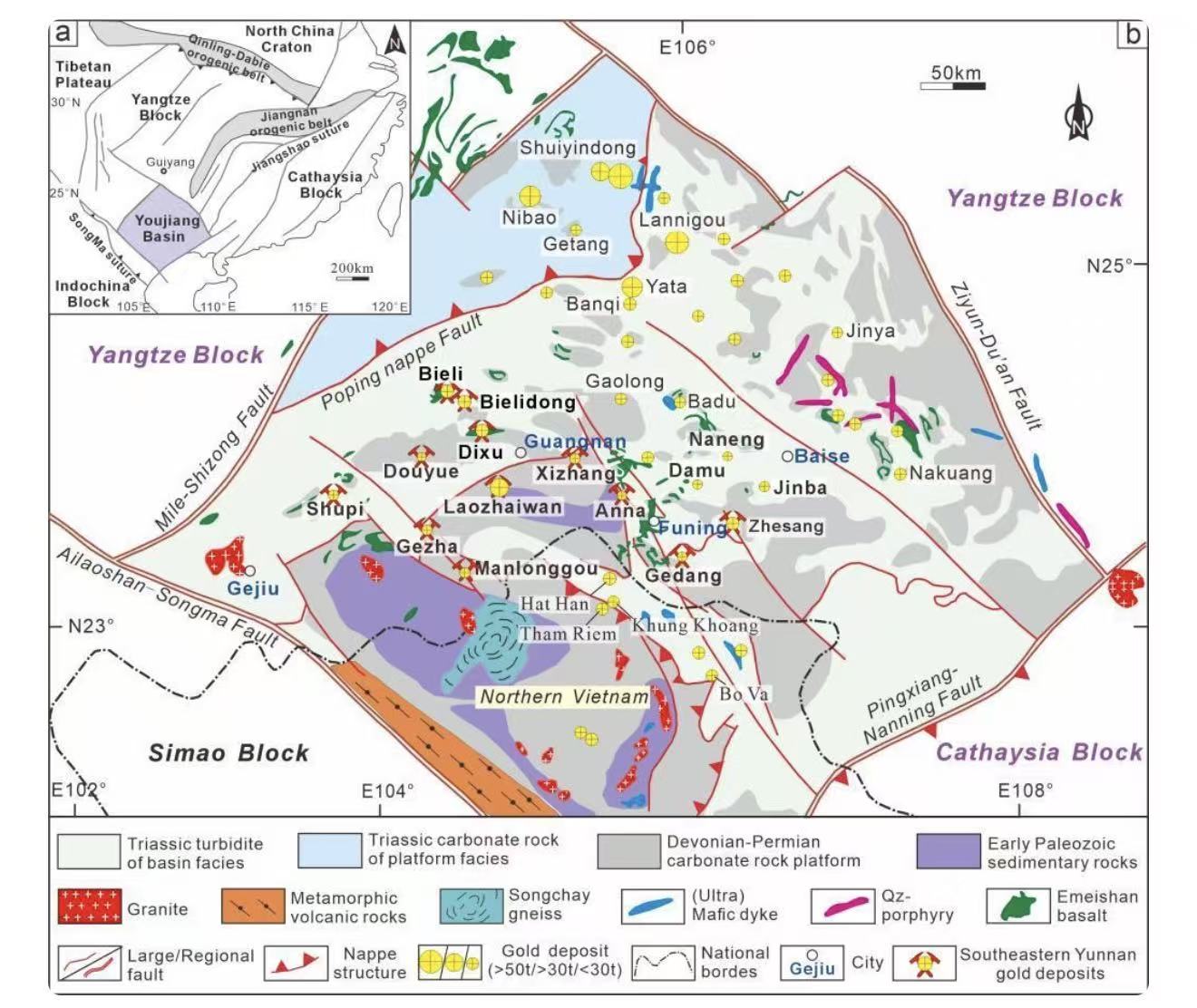 (a)右江盆地大地构造位置图;(b)区域地质及金矿床分布简图。