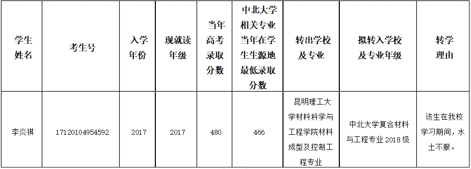 我校材料科学与工程学院材料成型及控制工程专业2017级学生李炎祺,因身体原因,申请转学到中北大学复合材料与工程专业2018级继续学习。