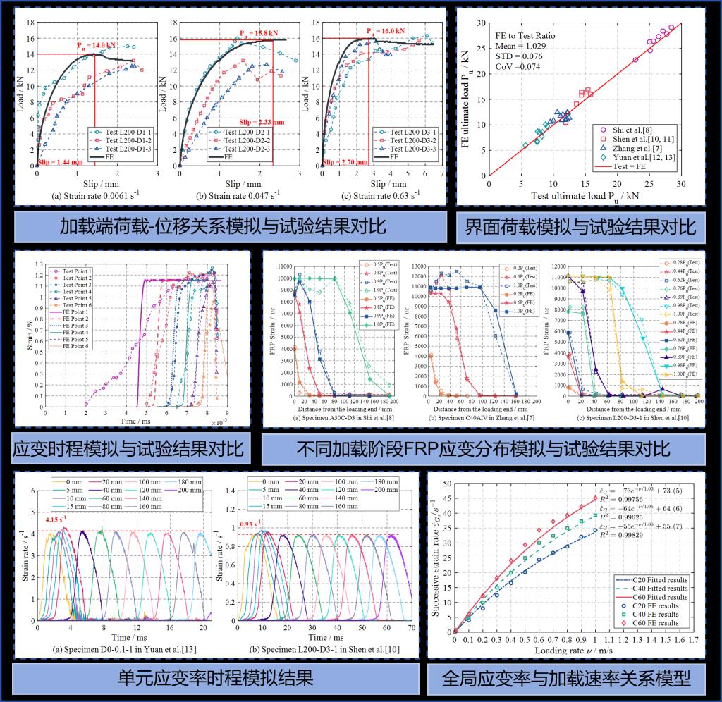 研究首先归纳整理了现有的动态荷载下的FRP-混凝土面内剪切试验数据,选取了具有良好试验可重复性且破坏模式为典型剥离破坏的动力试验作为基准,建立细观尺度有限元(FE)模型,合理引入材料动力增强因子(DIF)(团队先期研究提出的双修正模拟方案,发表于动力学和防护工程领域具有重要影响力的国际学术期刊《International Journal of Impact Engineering》),并通过该基准试验对模型进行验证。随后,开展参数分析,引入FRP 板剥离区域内各单元峰值应变率的平均值,即全局应变率,作为新的FRP-混凝土界面动态特征指标,用以定量描述整个脱粘过程中的动态效应;同时,研究了界面全局应变率与加载端加载速率之间的关系,提出了二者之间的关系模型以方便研究者完成界面动力特征指标标定。