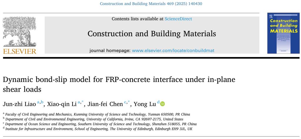 [1] Liao J Z, Li X Q*, Chen J F*, et al. Dynamic bond-slip model for FRP-concrete interface under in-plane shear loads [J]. Construction and Building Materials, 2025, 469. DOI: 10.1016/j.conbuildmat.2025.140430.
