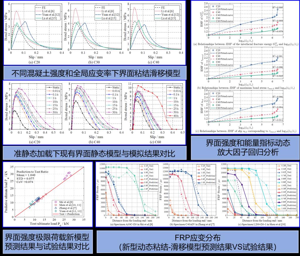 近期,昆明理工大学建筑工程学院李晓琴课题组(结构工程创新研究团队)与南方科技大学海洋系陈建飞团队合作在纤维复合材料(fiber reinforced polymer, FRP)和混凝土界面的动态粘结-滑移理论方面取得突破性进展,填补了FRP-混凝土动态界面行为研究的关键理论空白,为准确分析和预测爆炸、冲击等极端动态荷载下FRP 加固钢筋混凝土(RC)结构的动力响应提供了理论支撑与科学依据。相关成果以“Dynamic bond-slip model for FRP-concrete interface under in-plane shear loads/ FRP-混凝土界面动态粘结-滑移模型”为题,发表于建筑材料领域国际顶级期刊《Construction and Building Materials》上。昆明理工大学为论文的第一通讯单位,第一作者为廖俊智(昆明理工大学结构工程创新团队硕士研究生,获得国家留学基金委、美国加州大学和昆明理工大学资助与支持,现博士就读于加州大学尔湾分校),昆明理工大学建筑工程学院李晓琴教授和南方科技大学讲席教授陈建飞老师为论文的共同通讯作者。研究得到了国家自然科学基金项目、云南省兴滇英才计划-青年人才专项及中国国家留学基金委员会的资助。