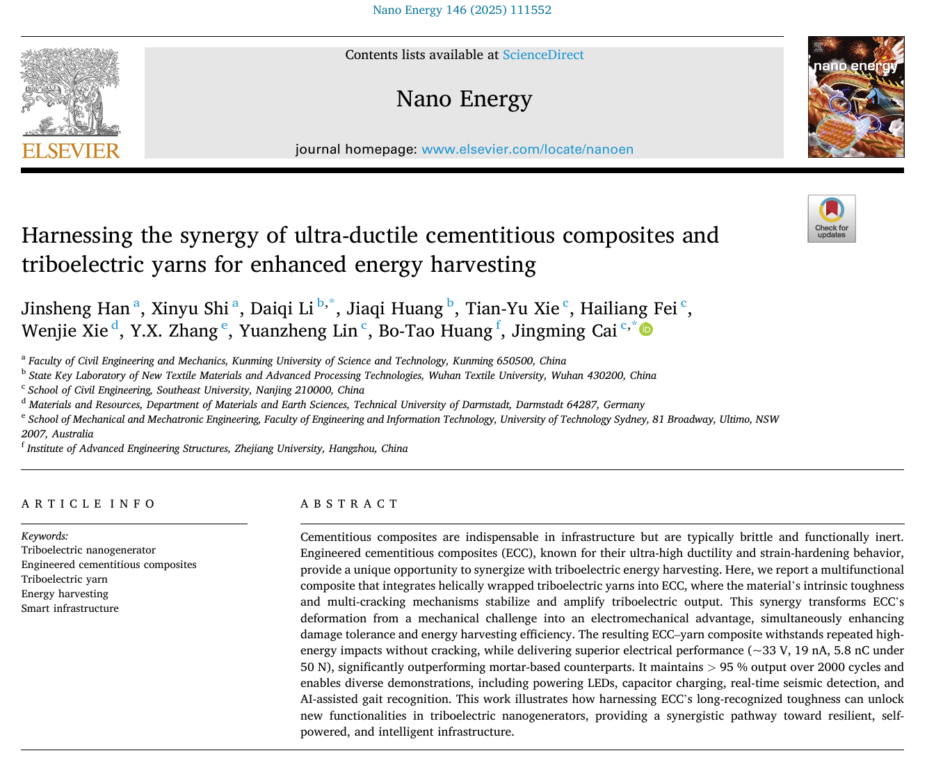 近日,昆明理工大学建筑工程学院韩进生课题组在高延性水泥基材料(ECC)与纳米能源收集领域取得新进展。该团队创新性地将摩擦纳米发电机(TENG)集成到ECC材料中,借助ECC的高延性与高韧性,实现摩擦电输出的稳定与放大,有效提升了能量收集效率。研究成果不仅为摩擦纳米发电机开发新功能提供了思路,更为构建具备韧性与自供电特性的智能基础设施提供了高效技术路径。相关成果以《Harnessing the synergy of ultra-ductile cementitious composites and triboelectric yarns for enhanced energy harvesting》为题,发表于纳米能源领域权威期刊《Nano Energy》上。