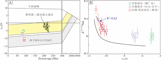 图4 本次研究的成矿花岗质侵入体的Nd同位素对比图:(A)εNd(t)值与年龄关系图;(B)稳定与放射成因Nd同位素关系图。黑色虚线代表含钼±铜、铜±钼和锡±钨花岗质侵入体的Nd同位素协同变化趋势;蓝色虚线表示含锡±钨花岗岩侵入体的线性回归趋势以及决定系数(R2)。
