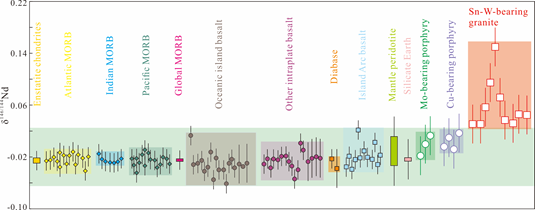 2. 锡±钨矿床的古老地壳印记:锡±钨矿床成矿花岗岩中重的δ146/144Nd值与低的εNd(t)值呈显著负相关(R2 = 0.62),结合古老地壳通常具有更低εNd(t)值的特征,表明成矿物质主要来源于富含较重稳定Nd同位素的古老大陆地壳(图3、图4)。