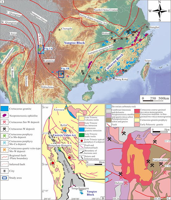 为解决这一难题,在李文昌教授与邓明国教授的指导下,昆明理工大学国土资源工程学院任龙与中国科学院广州地球化学研究所合作,对扬子板块西缘白垩纪多个大型-超大型矿床(包括铜厂沟钼±铜、红山–红牛铜±钼及都龙锡±钨矿床;图1)的成矿花岗质侵入体展开了系统研究。