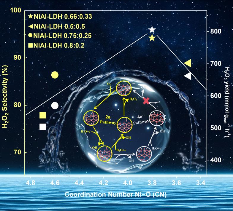 进展一以“Al-Induced Local Coordination Engineering of Ni: Steering the Two-Electron Oxygen Reduction Process”为题发表在《Advanced Functional Materials》上。过氧化氢作为一种绿色氧化剂和潜在能源载体,在水处理、化工合成等领域应用广泛。针对传统蒽醌法生产H2O2污染重、成本高、运输难的问题,以及电催化两电子氧还原反应 (2e− ORR)合成法缺乏高性能催化剂的瓶颈,研究团队创新提出配位工程策略,Al的引入可调控Ni的配位环境与p-d轨道杂化强度,重塑其局域电子结构。该催化剂在0.4 V vs. RHE电位下的H2O2选择性高达94.23±0.78%,循环20,000 次后性能无明显衰减;在120小时实际生产测试中,平均产率达805.53 mmol g−1h−1,平均法拉第效率为96.30%。催化剂对*OOH中间体吸附强度接近理想值,能抑制O−O键断裂、促使反应选择性遵循双电子路径生成H2O2,为绿色高效合成H2O2提供了新方案。