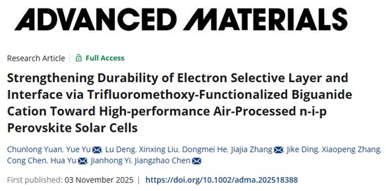 Chunlong Yuan#, Yue Yu#*, Lu Deng#, Xinxing Liu, Dongmei He, Jiajia Zhang*, Jike Ding, Xiaopeng Zhang, Cong Chen, Hua Yu*, Jianhong Yi, Jiangzhao Chen*. Strengthening durability of electron selective layer and interface via trifluoromethoxy-functionalized biguanide cation toward high-performance air-processed n-i-p perovskite solar cells. Advanced Materials 2025, e18388.