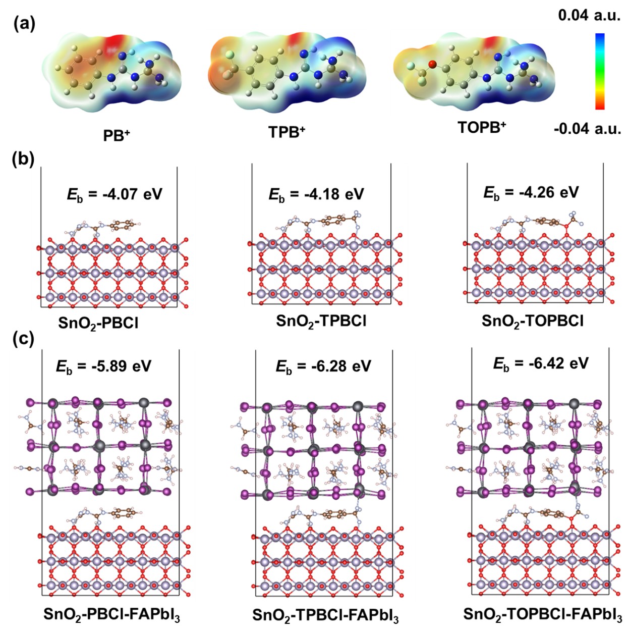 Figure 1. Theoretical investigation on the interaction of three biguanide cations with SnO2 and perovskite. a) ESP results of PB+, TPB+, and TOPB+ cations. b) Binding energy of PB+, TPB+, and TOPB+ adsorbed onto SnO2. c) Binding energy of PB+, TPB+, and TOPB+ located at SnO2/perovskite interface.
