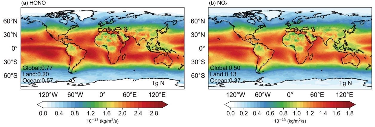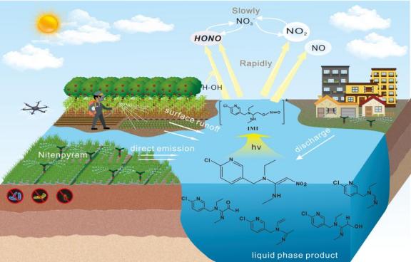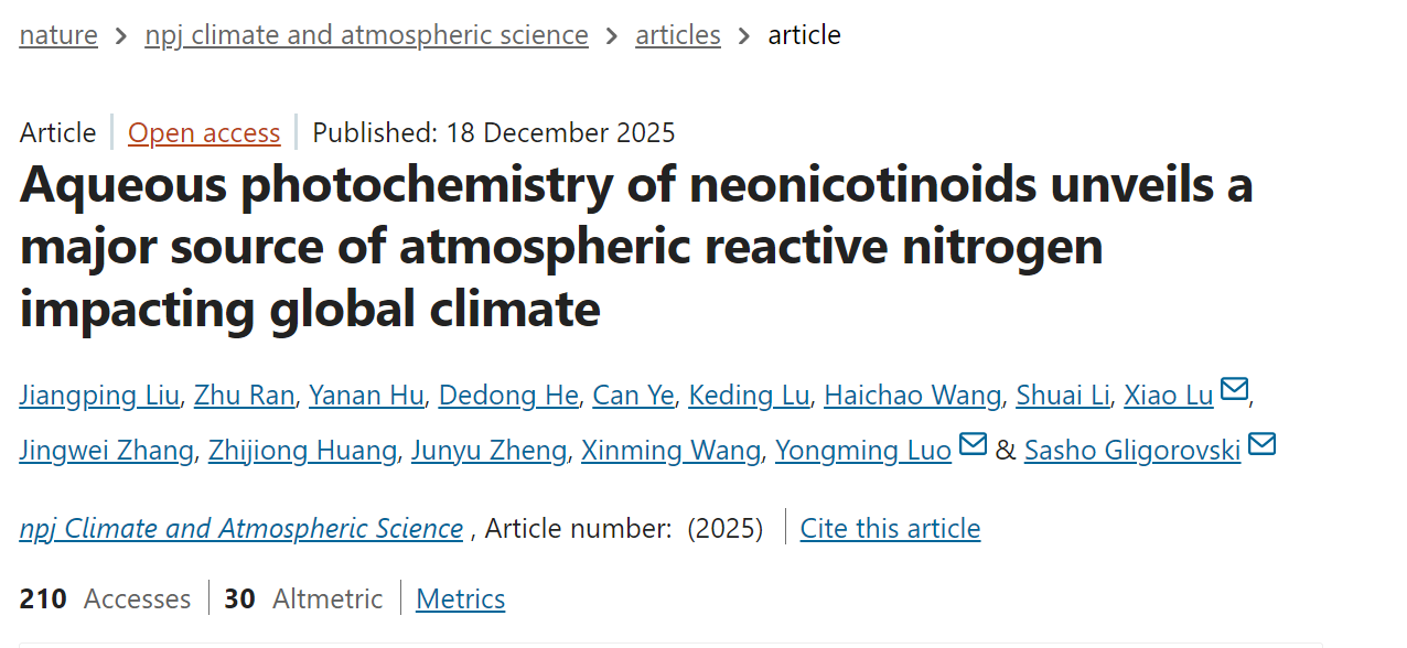进展一以《Aqueous photochemistry of neonicotinoids unveils a major source of atmospheric reactive nitrogen impacting global climate》为题发表在《npj Climate and Atmospheric Science》上。新烟碱类农药是重要新兴含氮污染物,占全球农药市场近30%。随着大规模使用,其环境残留问题日益引发关注。研究团队首次将农药光解与大气活性氮排放直接关联,解释了部分HONO和NOx的“失踪来源”问题,通过水相和气相产物分析以及密度泛函理论(DFT)计算,阐明了大气主要活性氮(HONO和NOx)反应路径,在基础上通过实验室导出动力学参数化的全球模型(GEOS-Chem),预估了新烟碱农药光解产生的年排放量为 71.2 Gg N yr−1(NOx)和 40.7 Gg N yr−1(HONO),进一步评估了对边界层的 HONO、臭氧和OH自由基浓度的影响。这项研究不仅为农药环境风险评估提供了新维度,也为跨学科研究(大气化学-农业生态-环境污染)树立了范例。