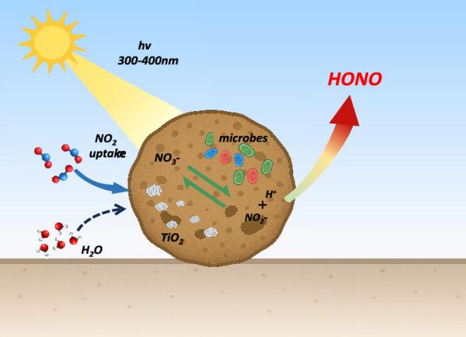 进展三以《Revisiting HONO Formation Mechanism by NO2 Conversion on Mineral Dust Surface 》为题发表在《Environmental Science & Technology Letters》上。针对矿质颗粒物NO2转化机制瓶颈,我们评估了来自世界不同地区(非洲、亚洲和北美洲)真实样品NO2非均相生成HONO情况,首次揭示了相对湿度、紫外线、二氧化钛以及矿物表面微生物的协同效应,为大气氮循环以及全球模拟提供了新的理论支撑。