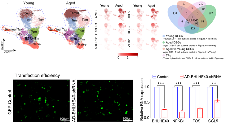 随后,还发现GZMB+ CD8+ T细胞中炎症反应以及衰老相关分泌表型显著高于GZMB-CD8+ T细胞,表明GZMB+ CD8+ T细胞亚组表现出更明显的衰老特征。尤为重要的是,本研究鉴定出转录因子BHLHE40,其激活的基因富含炎症相关及衰老相关通路,敲低人源CD8+ T细胞中的BHLHE40后,可显著降低促炎基因NFKB1、FOS和CCL5的表达,表明了其在年龄相关免疫重塑中潜在的保守作用。