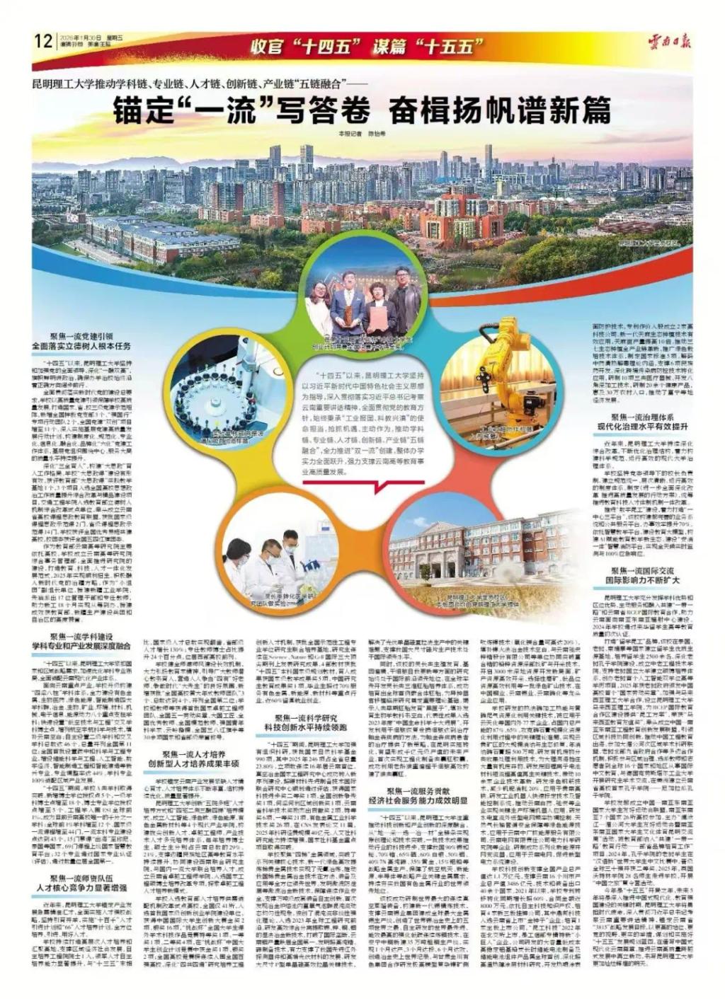 1月30日,《云南日报》以《昆明理工大学推动学科链、专业链、人才链、创新链、产业链“五链融合”——锚定“一流”写答卷 奋楫扬帆谱新篇》为题,专题报道昆明理工大学收官“十四五” 谋篇“十五五” ,奋力书写云南高等教育高质量发展昆工新篇章。