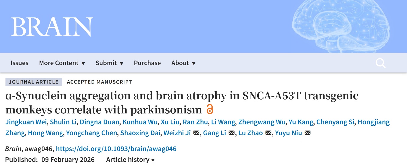 近日,昆明理工大学季维智/牛昱宇团队联合美国北卡罗来纳大学研究团队在Brain发表了题为“α-Synuclein aggregation and brain atrophy in SNCA-A53T transgenic monkeys correlate with parkinsonism”的研究。帕金森病(Parkinson’ Disease, PD)是一种常见的神经退行性疾病。随着中国人口老龄化的加剧,近三十年间,我国与帕金森病相关的疾病负担指标均呈快速上升趋势,严重影响老年人群的健康。PD通常以隐匿的睡眠障碍和躯体症状开始,当静止性震颤、运动迟缓等典型运动症状出现时,中脑黑质的多巴胺能神经元已发生大量丢失,此时治疗效果有限。因此,阐明PD前驱期的病理生理变化,是实现早期诊断与疾病干预的关键。然而,现有临床前模型,尤其是广泛使用的小鼠模型,在模拟人类PD复杂的、渐进的多系统病理及非运动症状(如与人类高度相似的快速眼动睡眠行为障碍)方面存在局限,极大地制约了对疾病起源和早期干预靶点的探索。