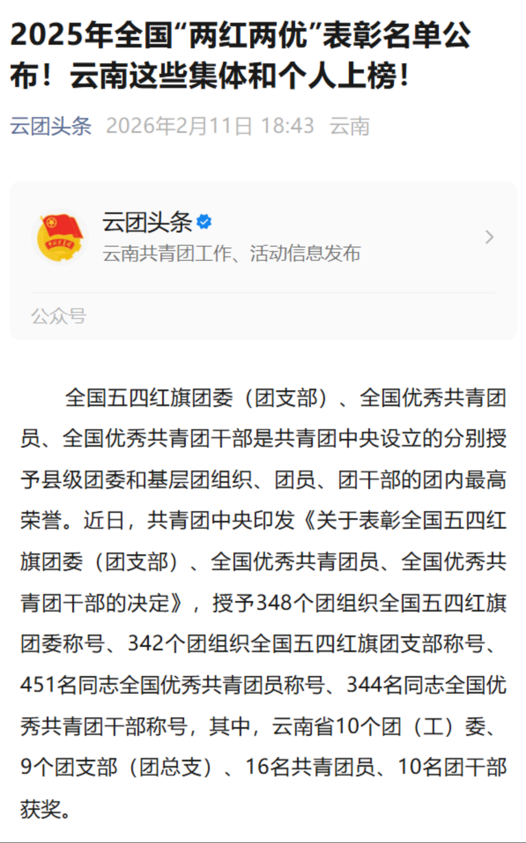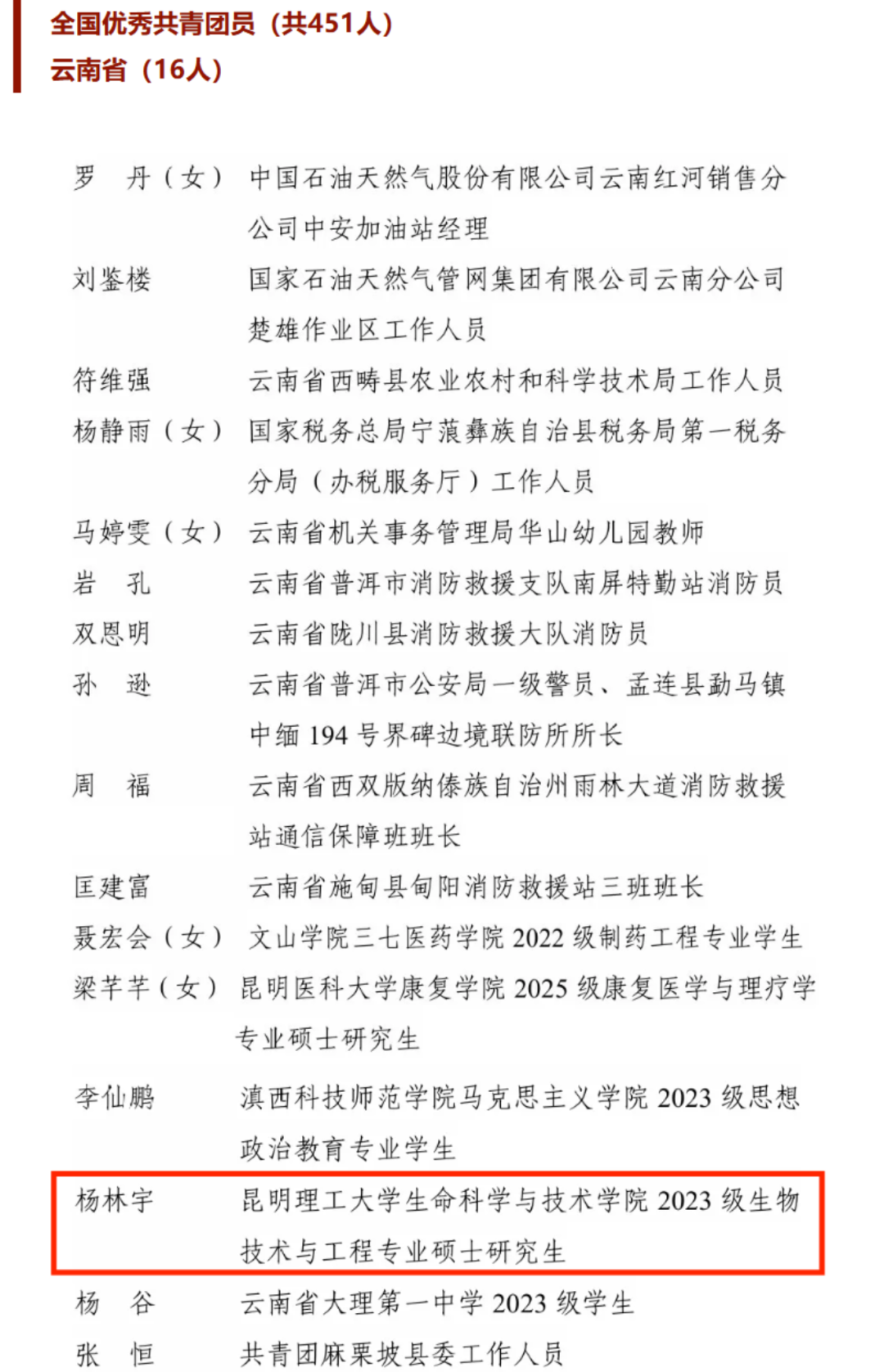 近日,共青团中央印发《关于表彰全国五四红旗团委(团支部)、全国优秀共青团员、全国优秀共青团干部的决定》,昆明理工大学生命科学与技术学院2023级硕士研究生杨林宇获评2025年“全国优秀共青团员”,云南省仅16人获此殊荣。