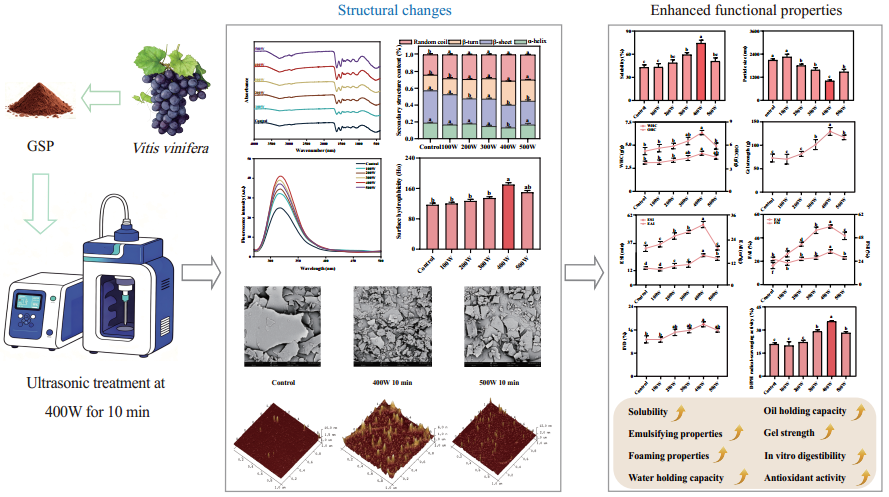 鉴于此,本研究针对葡萄籽蛋白,开展功率和时长依赖的超声处理实验,系统分析超声对葡萄籽蛋白溶液行为、多维结构的影响,评估超声引发的蛋白氧化损伤程度,筛选最优超声改性工艺,阐明超声调控葡萄籽蛋白结构与功能的内在机制,为葡萄籽蛋白这一葡萄酒产业副产物的高值化利用提供了绿色高效的改性策略,也为植物蛋白在食品工业和动物养殖业中的广泛应用开辟了新途径。
