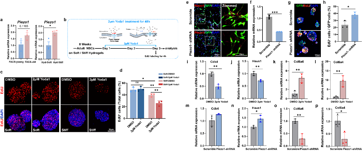 研究进一步发现,机械敏感离子通道 Piezo1 在衰老神经干细胞和高硬度环境中显著上调。药物激活 Piezo1 会进一步抑制神经干细胞增殖,而通过 shRNA 敲低 Piezo1 则能够恢复高硬度环境中神经干细胞的增殖能力,并逆转部分细胞周期与 ECM 基因表达变化。这表明 Piezo1 是介导微环境机械信号与神经干细胞衰老调控的重要机械感受器。