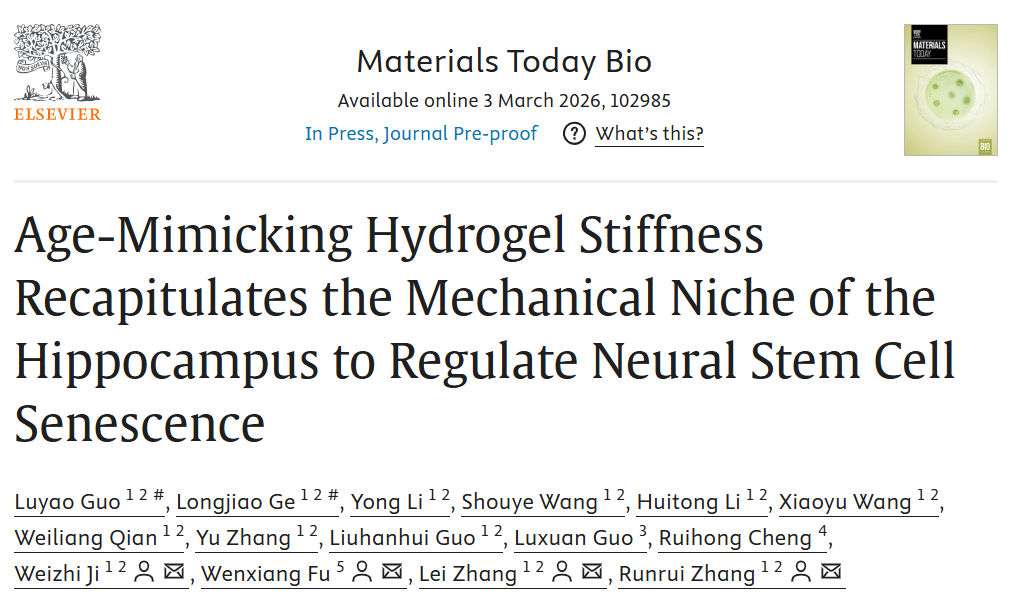近日,昆明理工大学季维智团队张润瑞/张磊课题组揭示水凝胶模拟大脑海马力学微环境调控神经干细胞衰老,为脑衰老机制解析提供新视角。