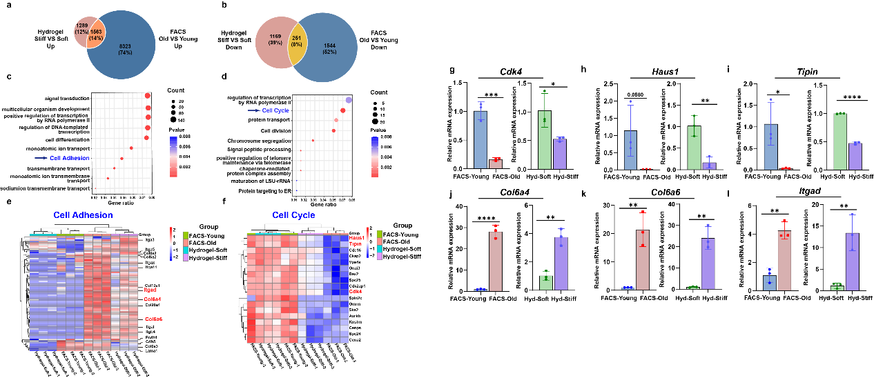 通过 RNA-seq 分析,研究团队比较了不同年龄神经干细胞以及在不同硬度基质中培养的细胞转录组变化。结果发现,微环境硬度变化能够重塑神经干细胞的基因表达谱,并与自然衰老过程中出现的转录变化高度一致。具体表现为细胞周期相关基因显著下调,而细胞黏附及 细胞外基质(ECM)相关基因上调。这一结果表明,组织硬度通过调控细胞周期和细胞黏附相关信号通路参与调节神经干细胞衰老过程。