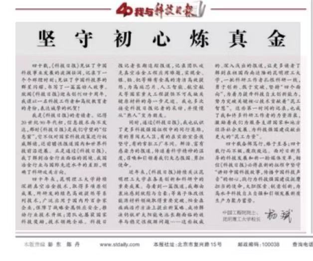 【我与科技日报】 中国工程院院士、昆明理工大学校长 杨斌 四十载,《科技日报》见证了中国科技事业发展的波澜壮阔,记录下一个个辉煌时刻;见证了中国科技界的群星闪耀,书写了一篇篇动人故事。欣闻《科技日报》...
